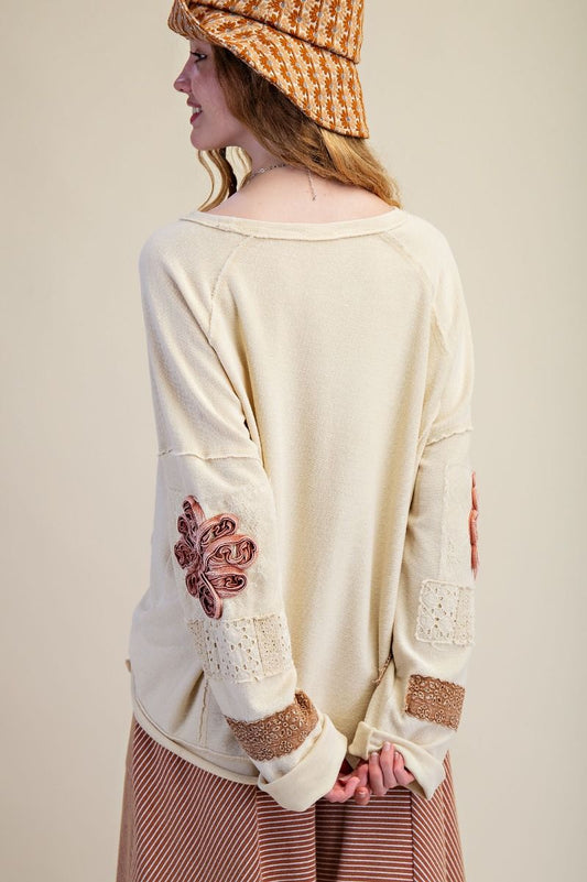 Easel Long Sleeve Boatneck Lace Mineral Washed Pullover