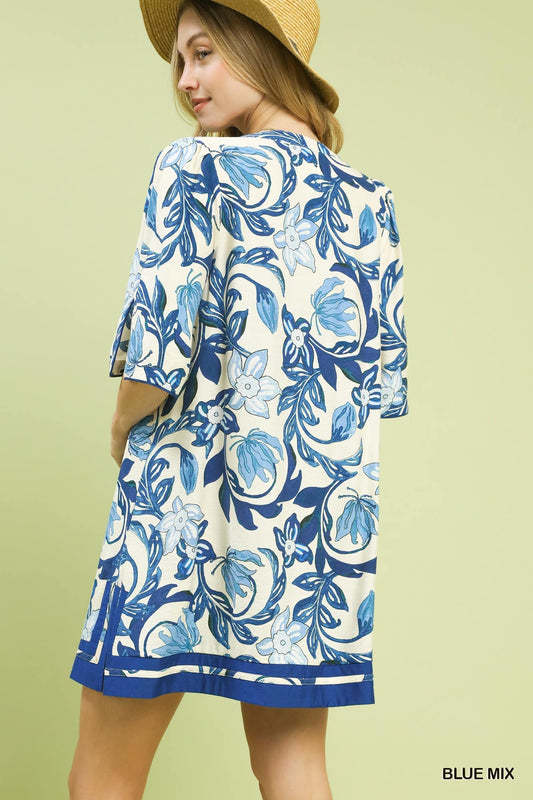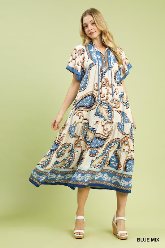 Umgee Blue Mix Paisley Print Midi Dress with Contrast Trim