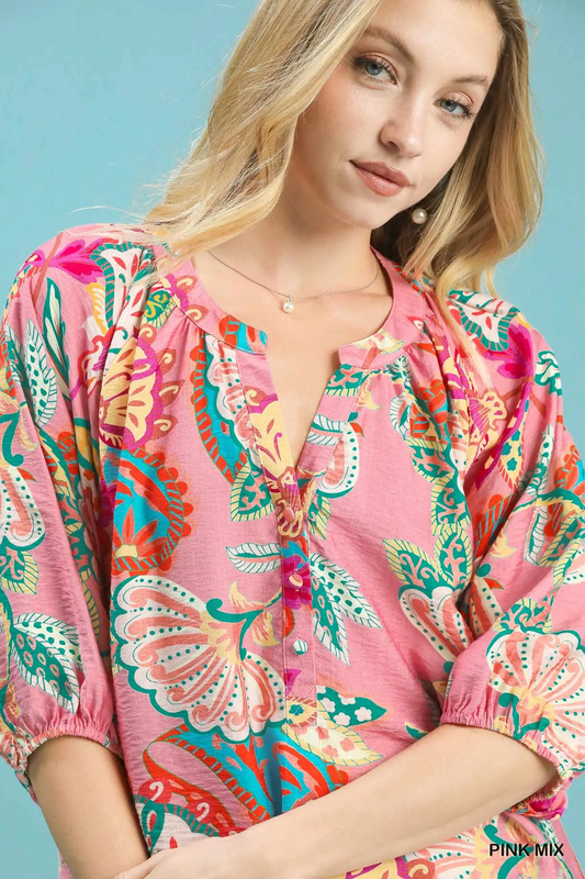 Umgee Plus Size Coral Boho Border Print Peasant Top