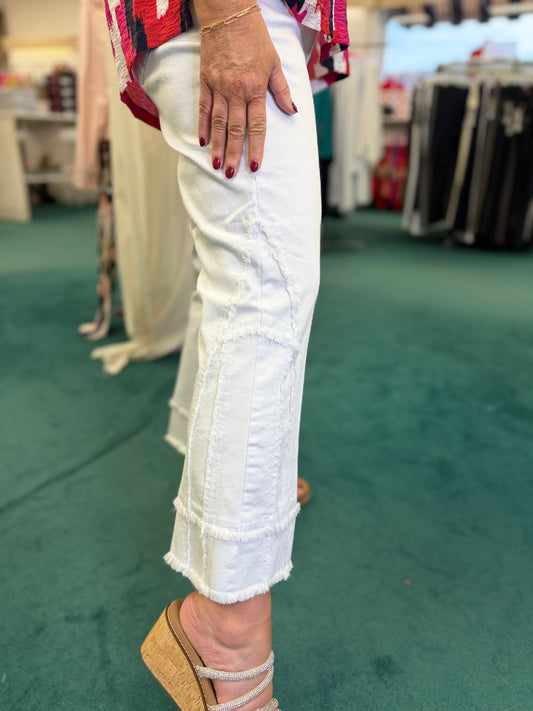 FLARE LEG CROP PANT WITH FRINGED TRIM - WHITE
