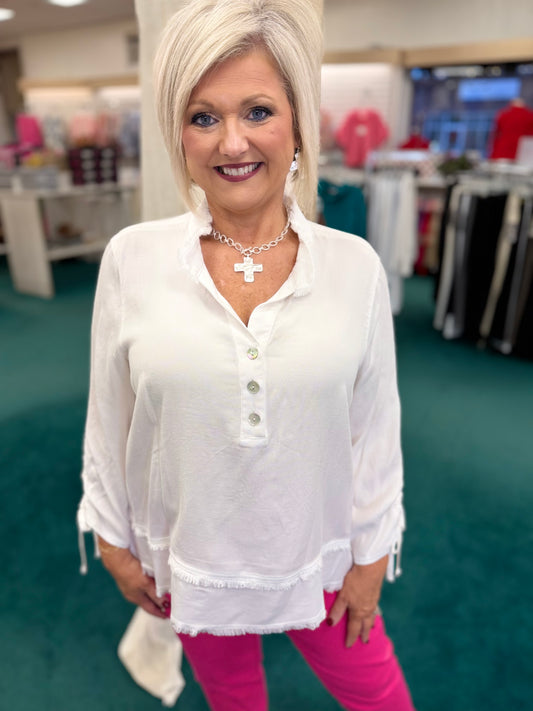 3/4 DRAWSTRING SLEEVE BAND COLLAR DOUBLE FRINGE HEM PULLOVER - WHITE
