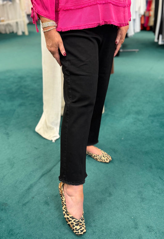 WIDE LEG DENIM CROP JEAN WITH FRINGE HEM - Black Denim