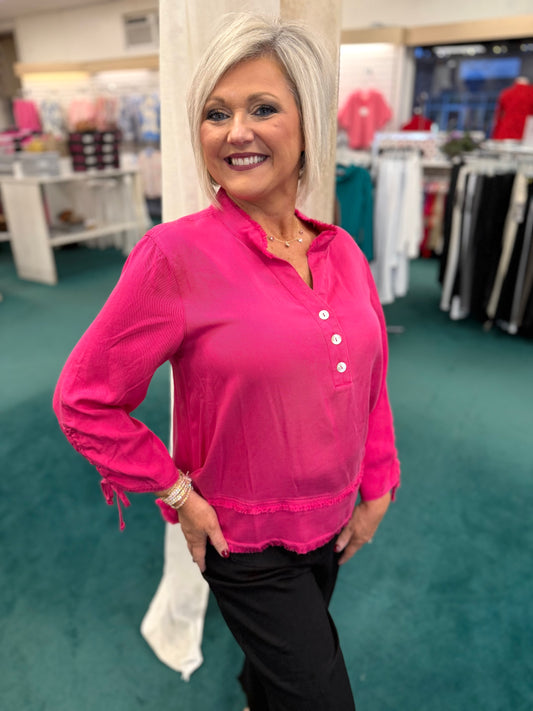 3/4 DRAWSTRING SLEEVE BAND COLLAR DOUBLE FRINGE HEM PULLOVER - CANDY PINK