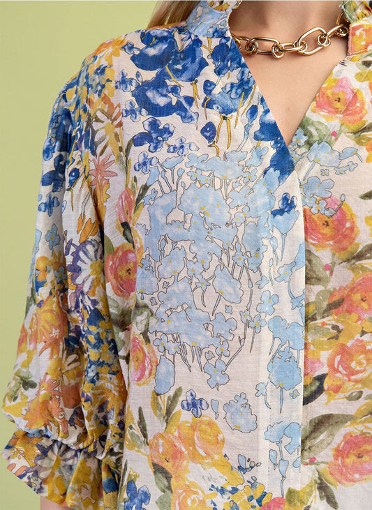 Umgee Plus Size Blue Mix Floral Print Balloon Sleeve Top