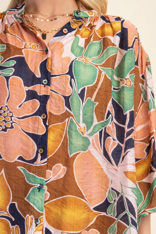Gigio Batwing Blouse with Mandarin Collar and Fabric Covered Buttons