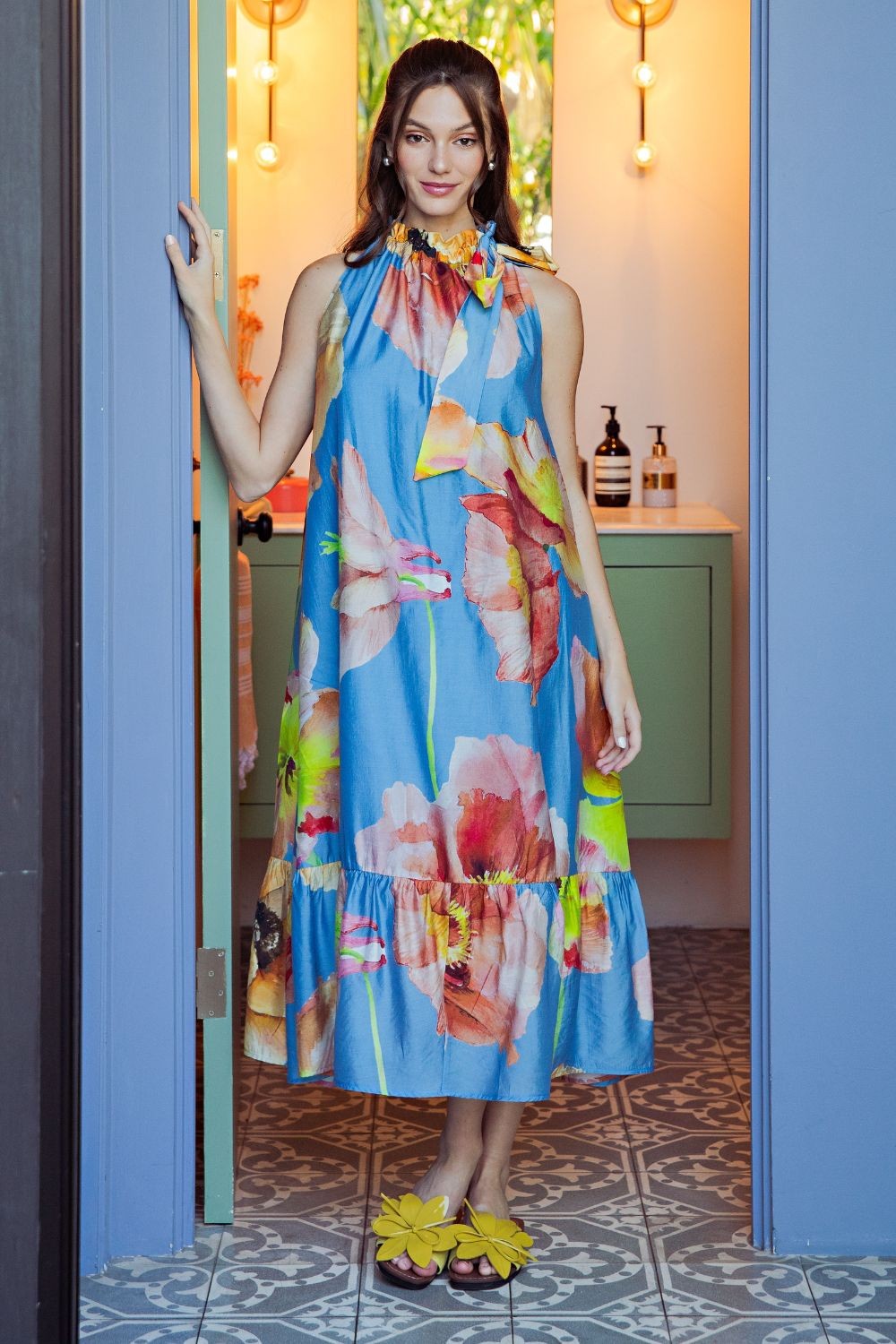 Glam Blue Ruffle Neck Tie Sleeveless Midi Floral Dress