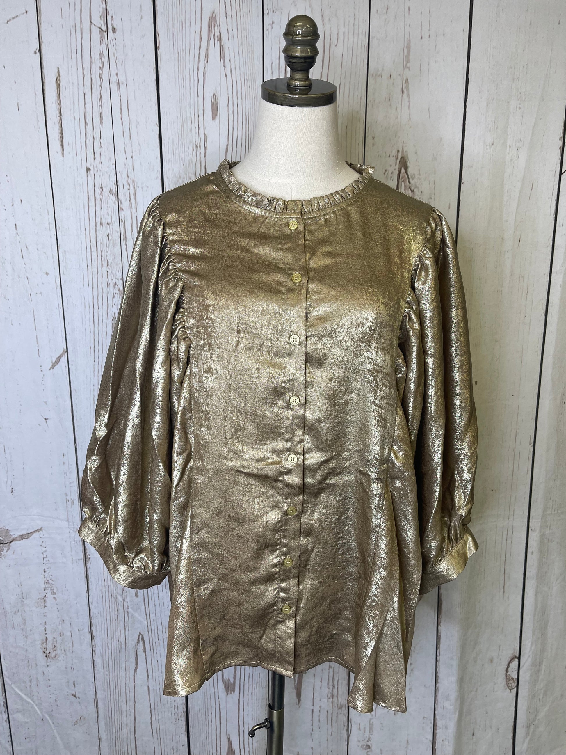 Shimmer foiled printed button front blouse with long exaggerated puff sleeves and ruffled neckline.